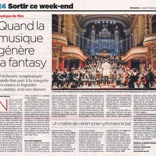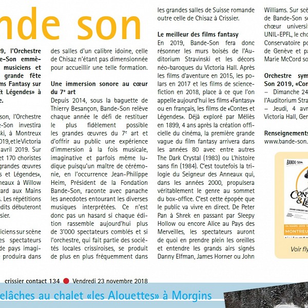 Pour la saison 2019, l'Orchestre symphonique Bande-Son, augmenté du Choeur de l'université de Lausanne UNIL-EPFL et la Maîtrise du Conservatoire populaire de Genève, a rendu hommage aux plus grands films de "Contes & Légendes" appelés aussi "Fantasy Movies".